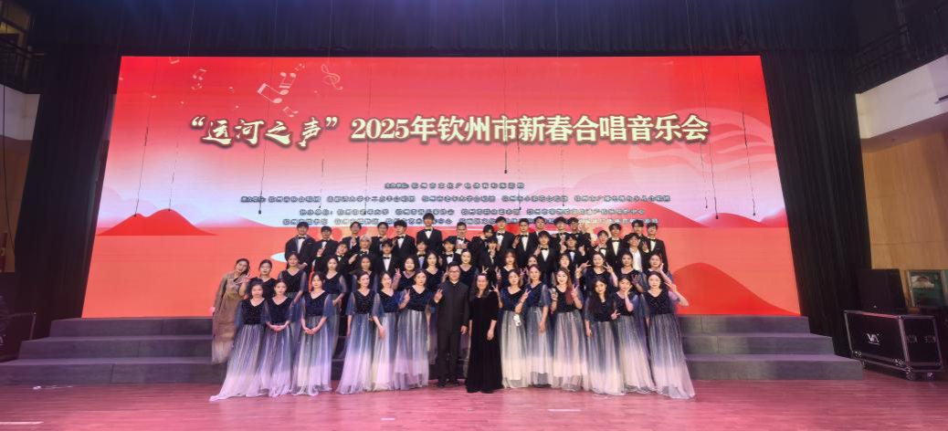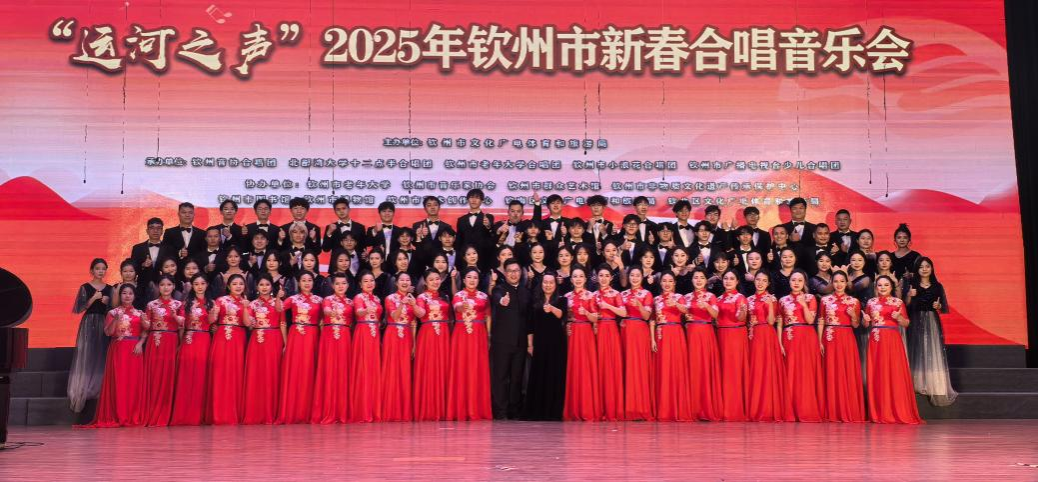 1月8日,由钦州市文化广电体育和旅游局主办的“运河之声”2025年钦州市新春合唱音乐会在钦州市老年大学举办。学院青年指挥解巍老师、钢琴艺术指导张阳老师以及“十二点半”合唱团共56位师生应邀参加了本次音乐会。