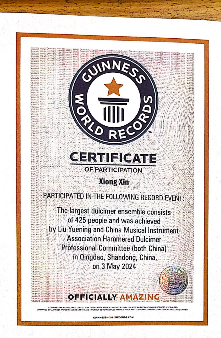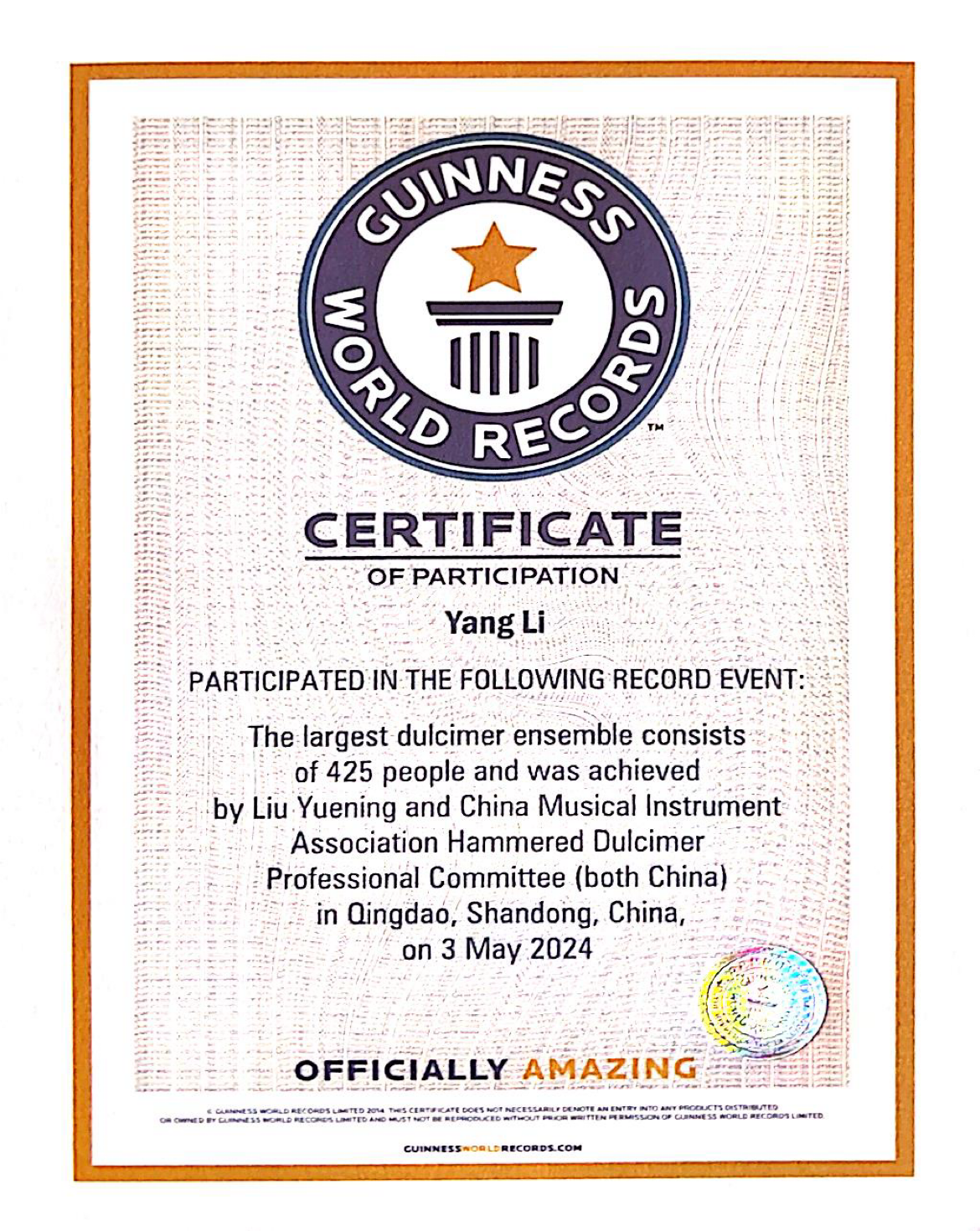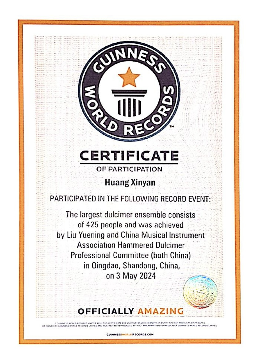 吉尼斯世界纪录英国总部为我院古维迎师生颁发的吉尼斯世界纪录挑战成功证书