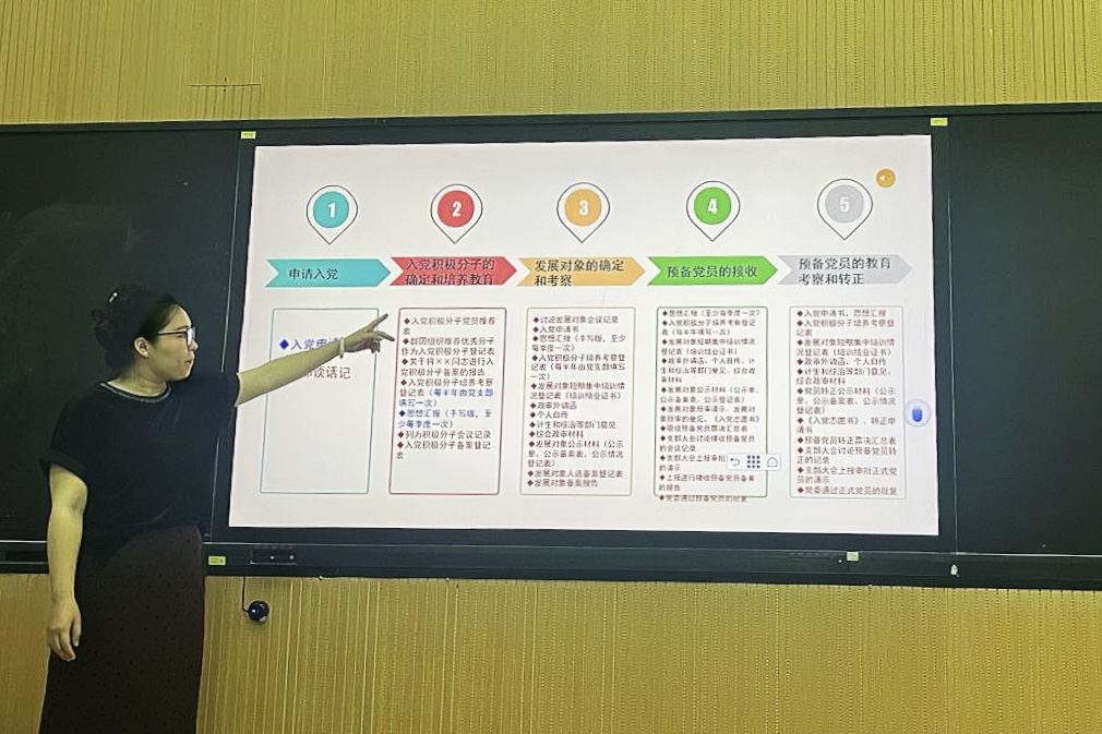 4月26日晚,人文学院党委副书记曾曦于12号教学楼105室进行授课。她以“中国共产党——走在时代前列的先锋、发展党员的程序及思想汇报等文书写作”作专题培训内容,帮助入党积极分子更加全面、深入地了解中国共产党,明晰入党流程,提升政治素养和理论水平。
