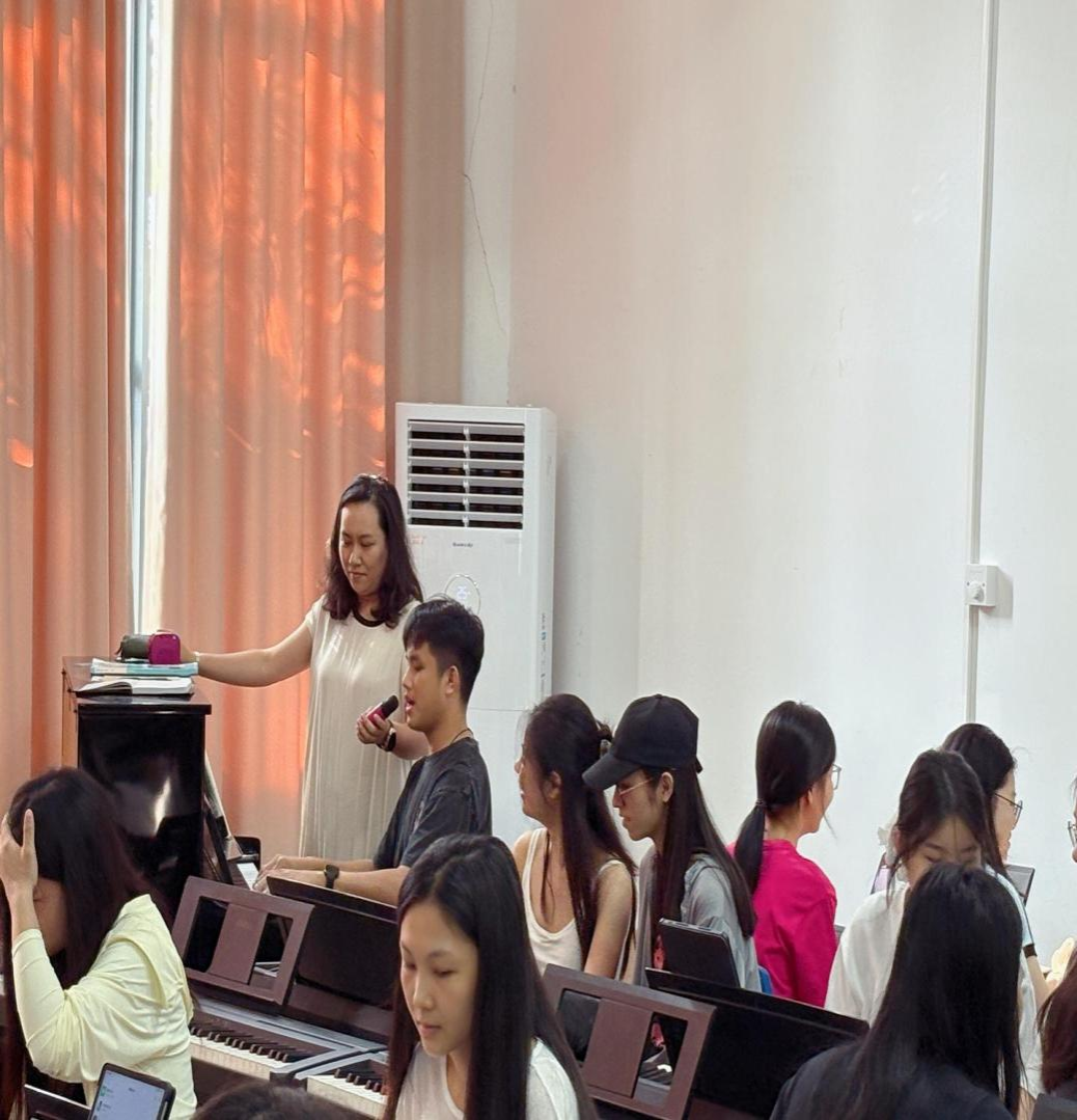 张阳老师以学生为中心,结合学生个体差异精准设定教学重难点。课堂融入思政元素,通过歌曲人文精神与家国情怀的解读,深化课程内涵。教学中,师生互动观摩、“一对一”即兴弹唱指导等环节,通过直观的教学方式使学生更深刻的理解伴奏编配技巧。张老师还通过小组讨论及启发式提问引导学生自主探索,有效提升课堂互动性与参与度。