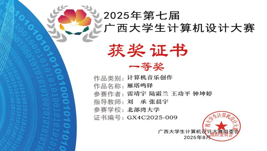 2025年8月,第七届广西大学生计算机设计大赛评选结果正式公布。学院学生团队创作的计算机音乐作品《雁塔鸣铎》在“计算机音乐创作”类比赛中表现突出,荣获一等奖。这是学院在跨学科创新实践领域的又一重要突破,充分彰显了学院“新艺科”建设与教学改革的显著成效。