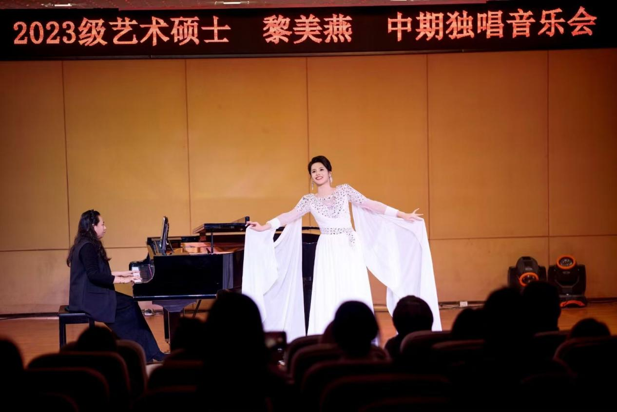 黎美燕独唱音乐会共呈现了十六首声乐作品,体裁广泛、题材丰富、演唱形式多样。音乐会在歌曲《我心爱的意中人》中正式拉开帷幕,这首歌曲为意大利艺术歌曲,为观众们营造了一个细腻如诗的爱情氛围。随后,黎美燕同学用她那流畅的气息和悠远的歌声,为大家带来了《越人歌》《梨花颂》《青玉案·元夕》等一系列中国传统艺术歌曲,传达出浓浓的中式传统之美。而下半场带来的三首广西北部湾地区的地方歌曲《过桥风吹》《湾湾歌》《幸福网》,歌曲以细腻委婉、唯美动听、以及方言演唱,赢得了现场观众的阵阵掌声,同时也体现了我院研究生教育教学与地方传统文化相结合。