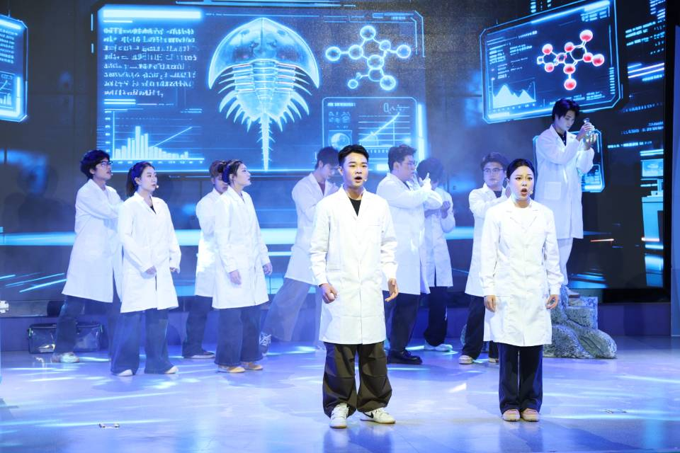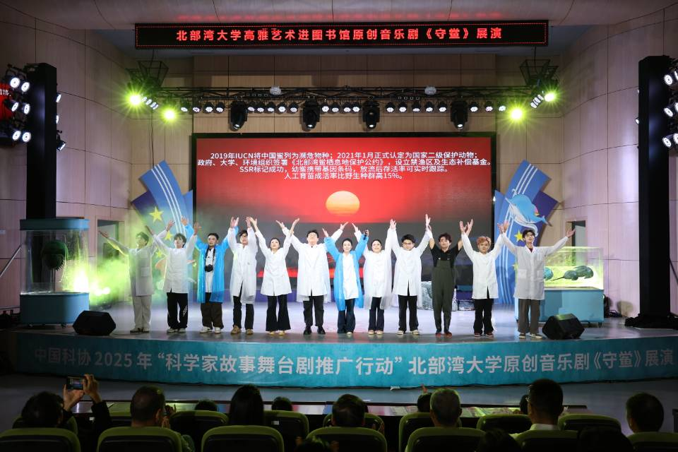 《守鲎》聚焦北部湾珍稀物种中华鲎的保护,以学校廖永岩教授及其团队真实事迹为原型,融科研探索、生态保护与家国情怀于一体,深刻地诠释了新时代科技工作者“把论文写在祖国大地上”的使命担当。全剧通过动人旋律和戏剧张力,传递“保护者得益、百姓有生计”的可持续保护理念,将科学精神与生态文明价值融入艺术表达,使观众在沉浸体验中感受科技工作者的奉献精神,让学生在参演过程中领悟科学家精神的深刻内涵,激发青年学子投身海洋强国建设的志向。据悉,该剧经学校科学技术协会推荐,入选中国科协2025年“科学家故事舞台剧推广行动”优秀剧目。